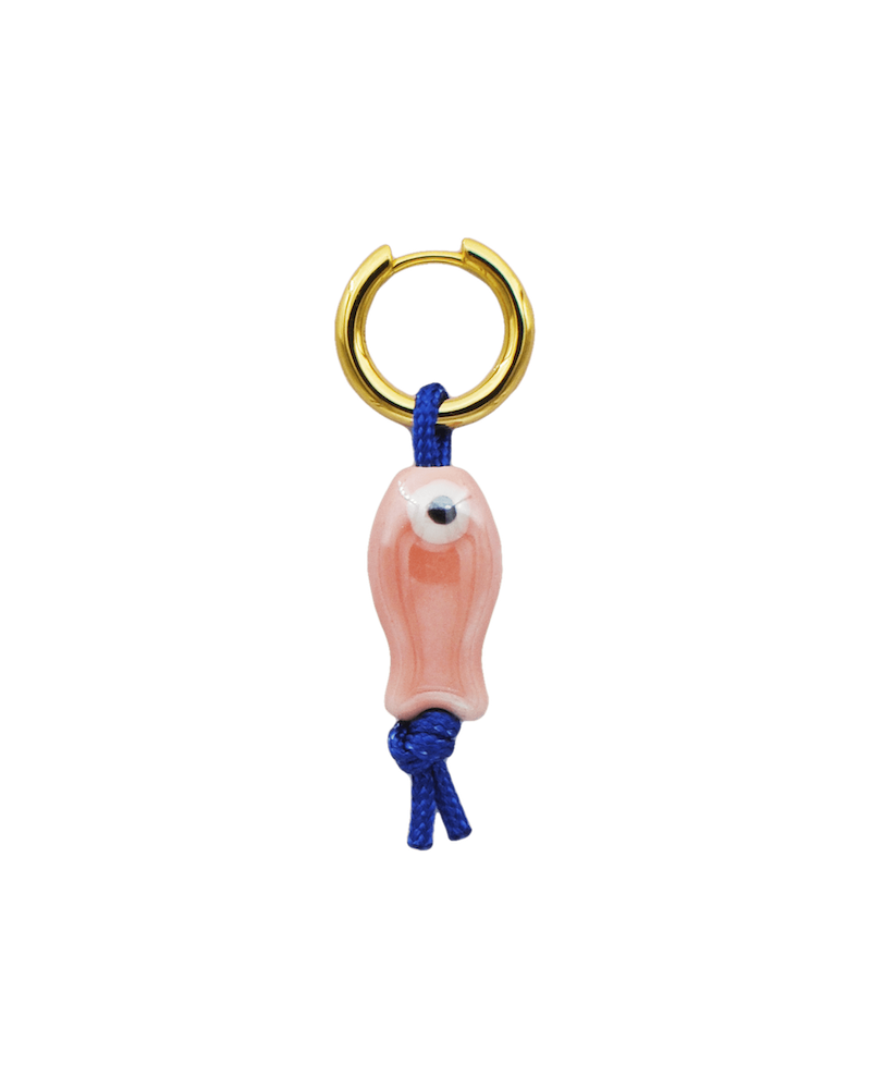 Huggie ørering med lyserød fisk i keramik på blå polyestersnor.