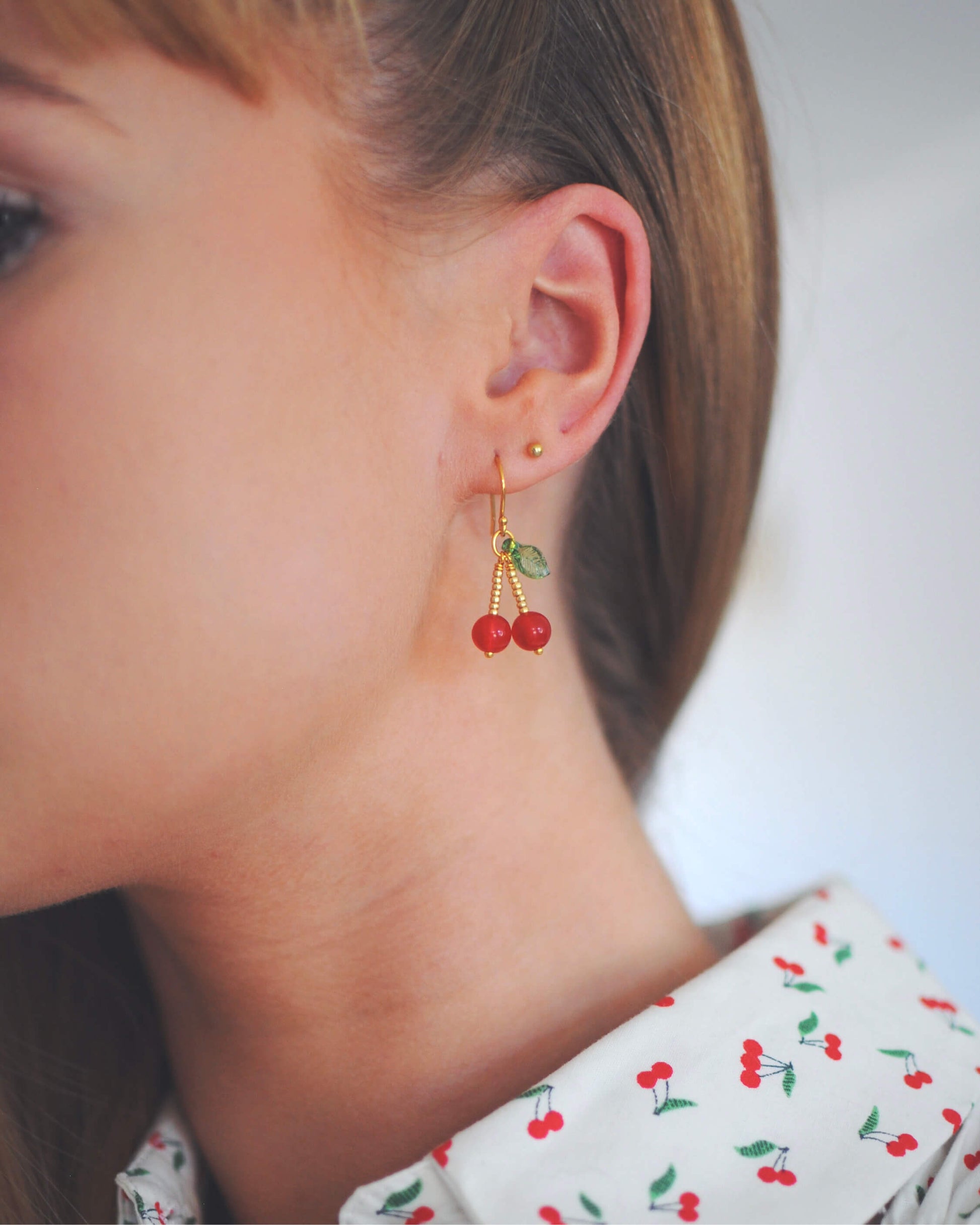 Ørebøjle i 18 karat forgyldt sterling sølv med kirsebær vedhæng af røde jadesten.