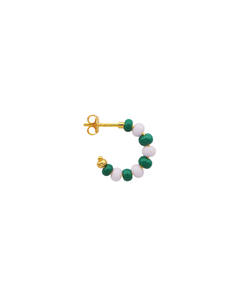 Åben hoop i 18 karat forgyldt sterling sølv med glasperler i lyserød og mørkegrøn.
