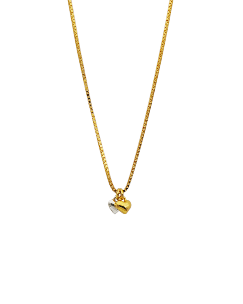 Halskæde i 18 karat forgyldt sterling sølv med to små hjerter i henholdsvis sølv og forgyldt sølv.