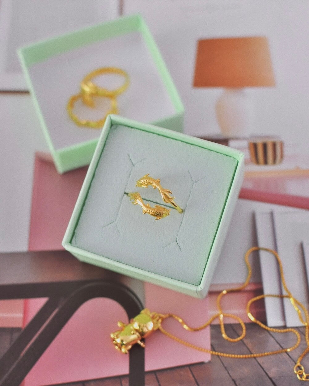 Lad disse to fine karper svømme omkring din finger. Ringen er justerbar og kan udvides til præcis den størrelse du ønsker. Ringen er i 24 karat forgyldt sterling sølv og belagt en afsluttende coating, der gør den ekstra slidstærk og modstandsdygtig overfor vand.