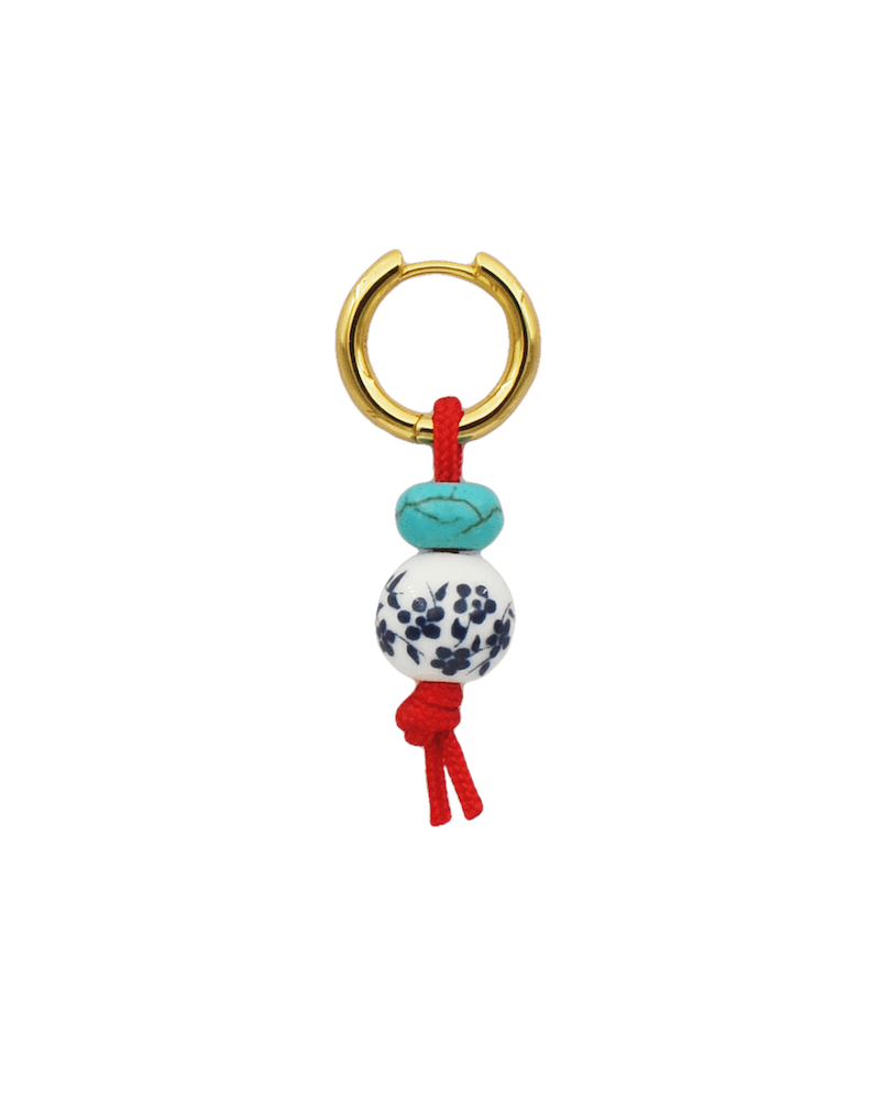 Huggie ørering med tyrkis stenperle og blomstret keramikperle, på rød polyestersnor. Navnet "Lianu" klinger på det kinesiske ord "Lian" (lotus blomst), og referer til øreringens blomstrede udtryk.