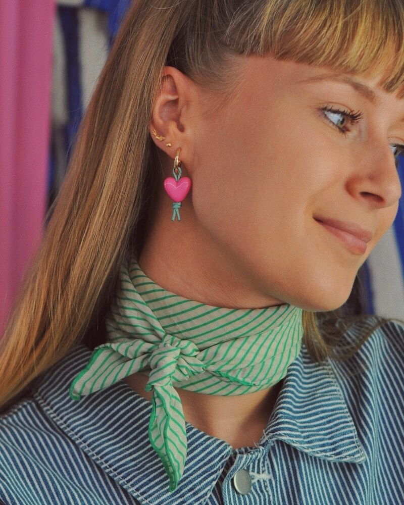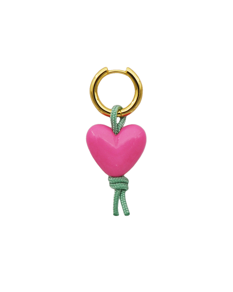 Huggie ørering med stort pink hjerte i resin på grøn polyestersnor.