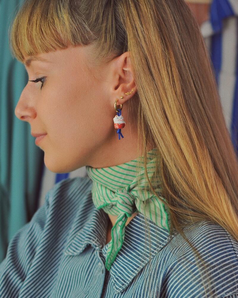 Huggie ørering med en fin Maneki Neko (vinkekat) keramikperle på blå polyestersnor.