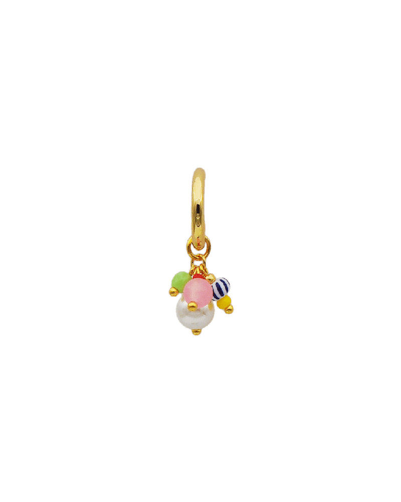 Åben hoop med en shell pearl og vedhæng af farverige glasperler.