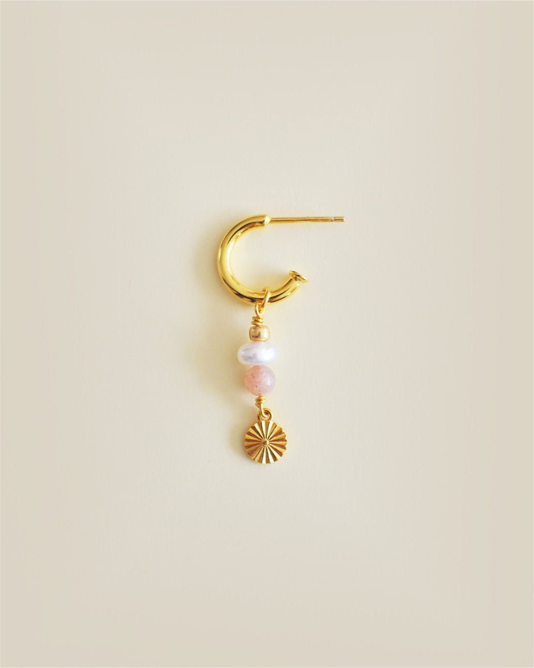Åben hoop i 18 karat forgyldt sterling sølv, med en ægte ferskvandsperle og en fersken månesten.