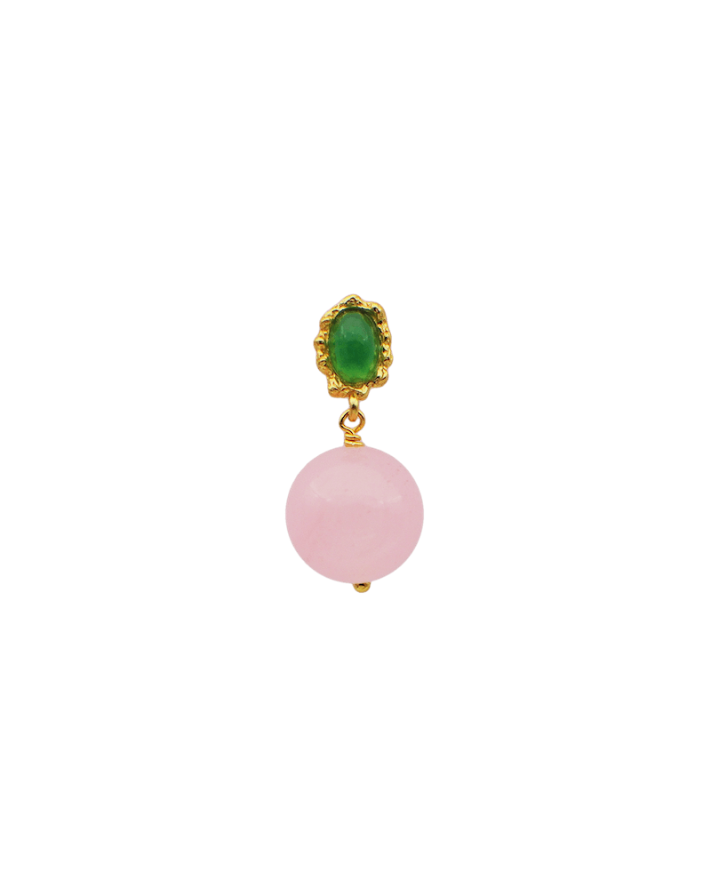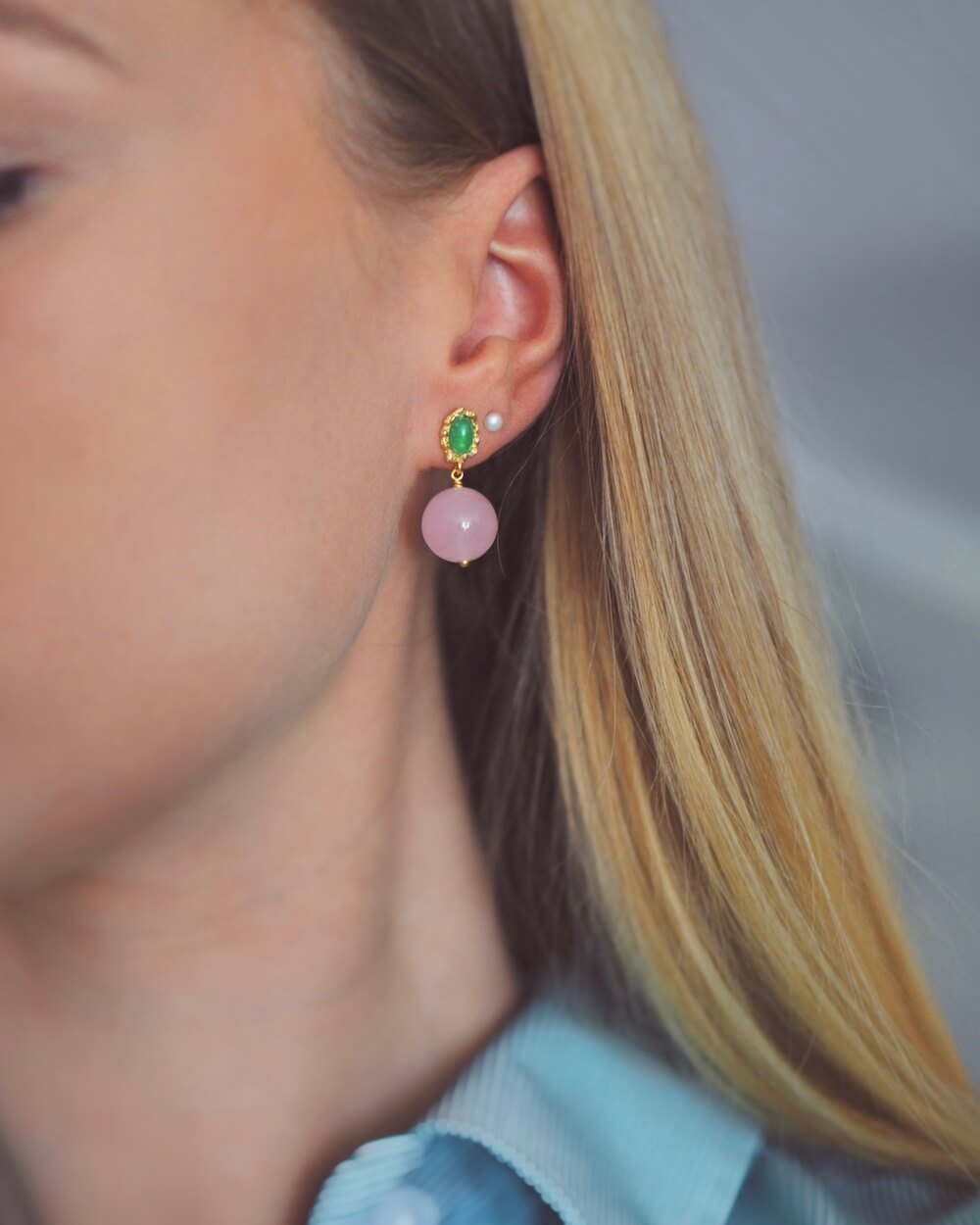 En grøn onyx og en stor smuk lyserød jadeperle har fundet sammen i denne gyldne ørestik.