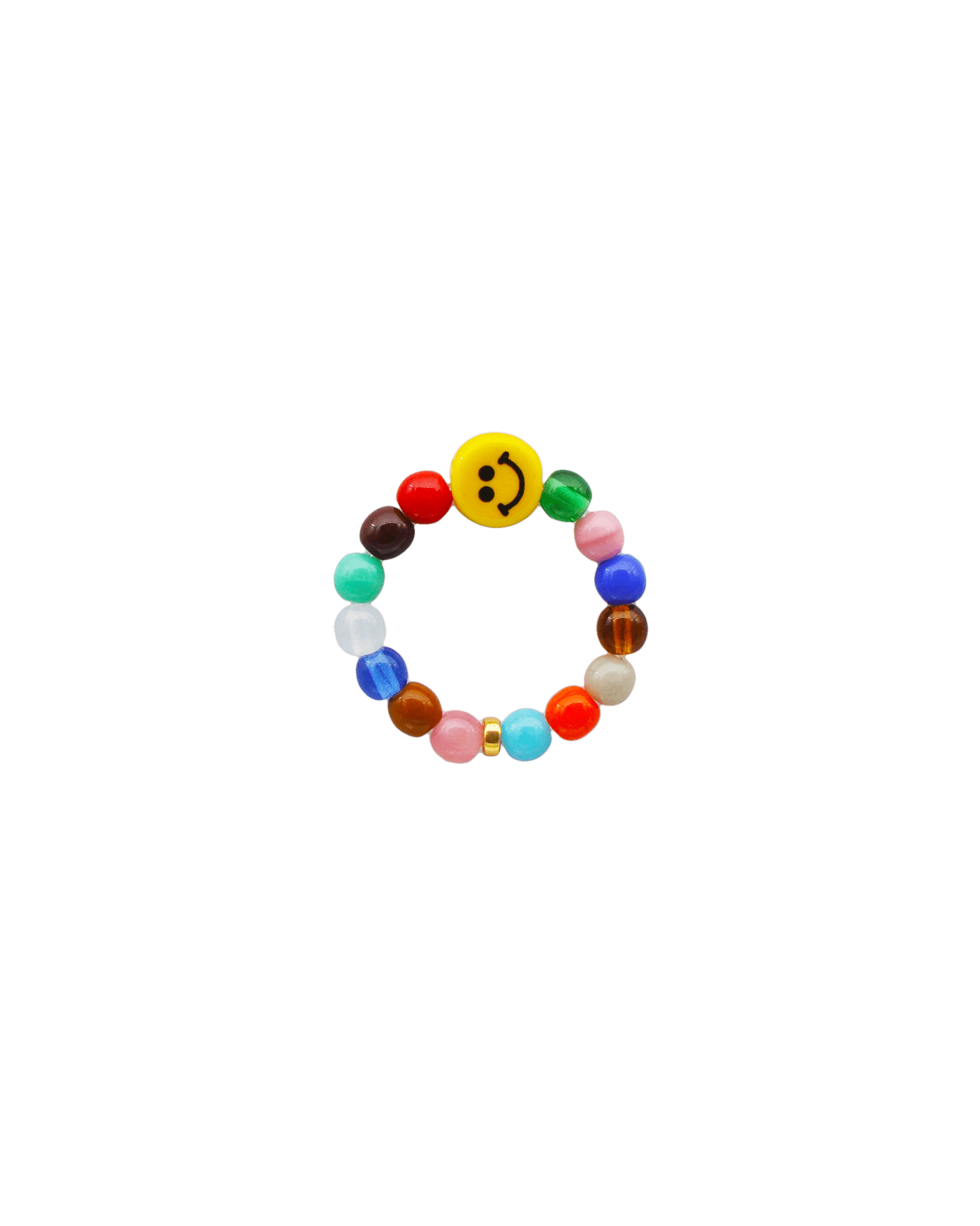 Smiley ring med en smuk blanding af farverige glasperler. Glasperlerne er gennemfarvede og vil derfor aldrig falme. Ringen er bundet på stærk powercord elastik.