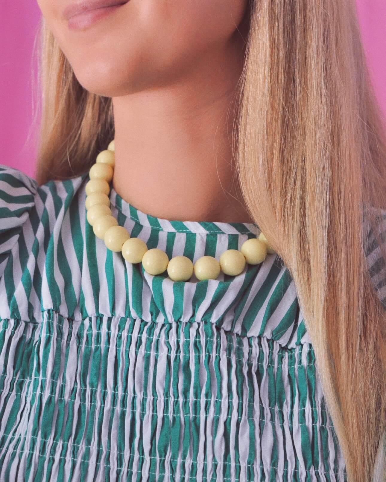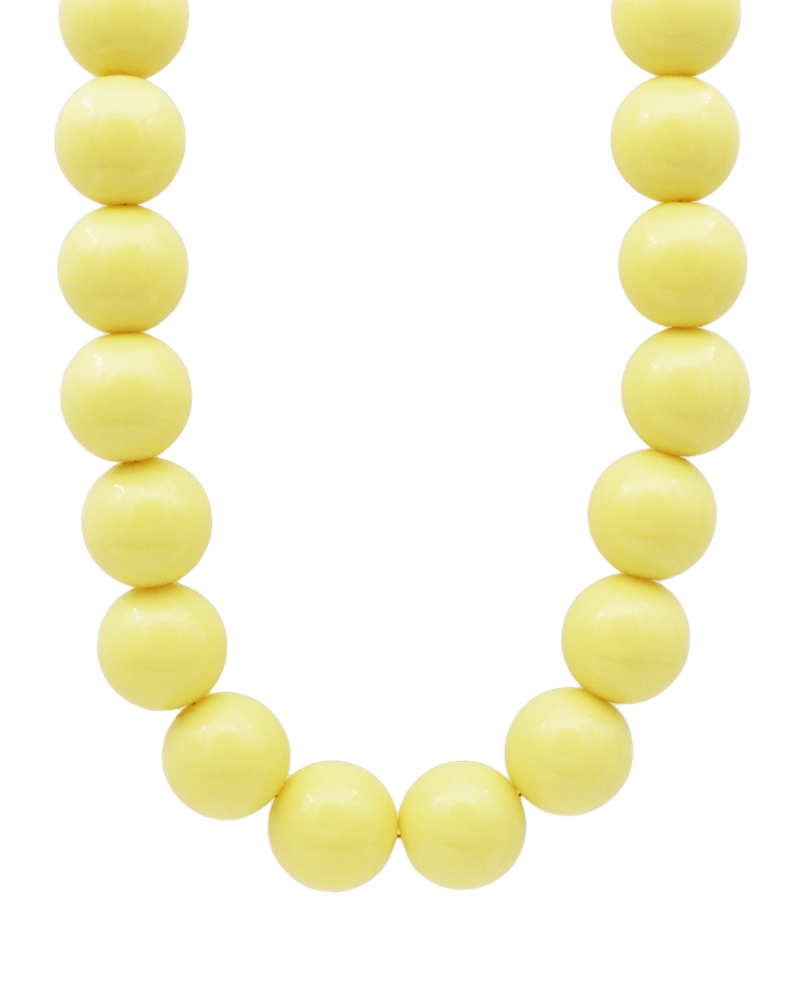 Halskæde af store, lækre, lysegule akrylperler. Halskæden er dejlig let og kan bæres dagen lang. Justerbar længde.