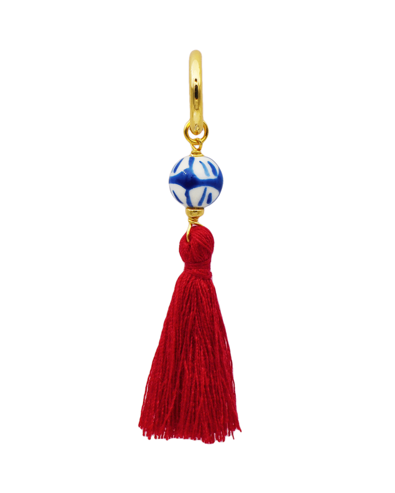 Ørering med mønstret keramik perle og smuk vinrød kvast.