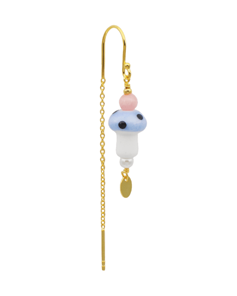 Ørebøjle med kæde. Rosa glasperle, blå svamp i keramik og perlemorsperle.